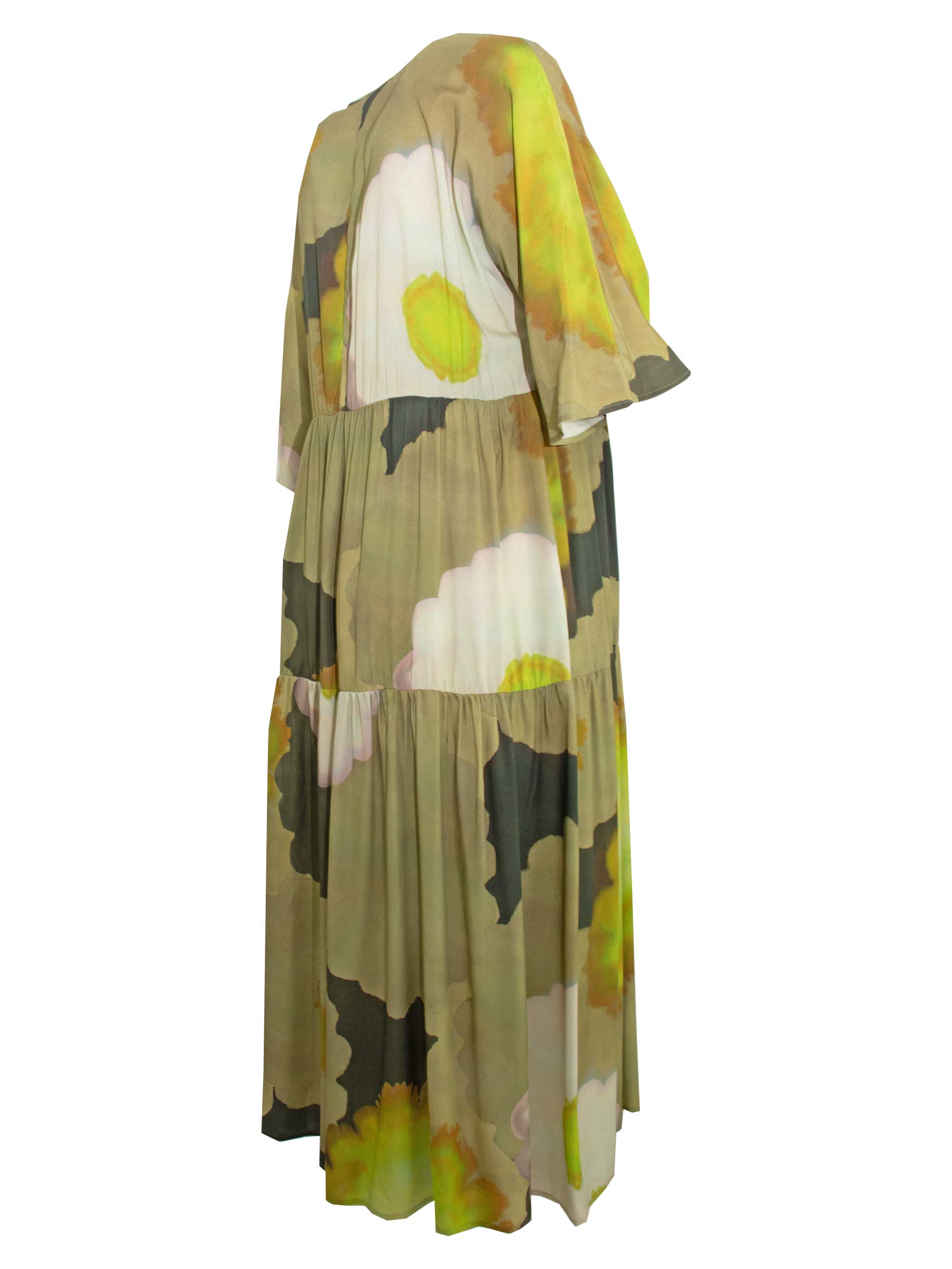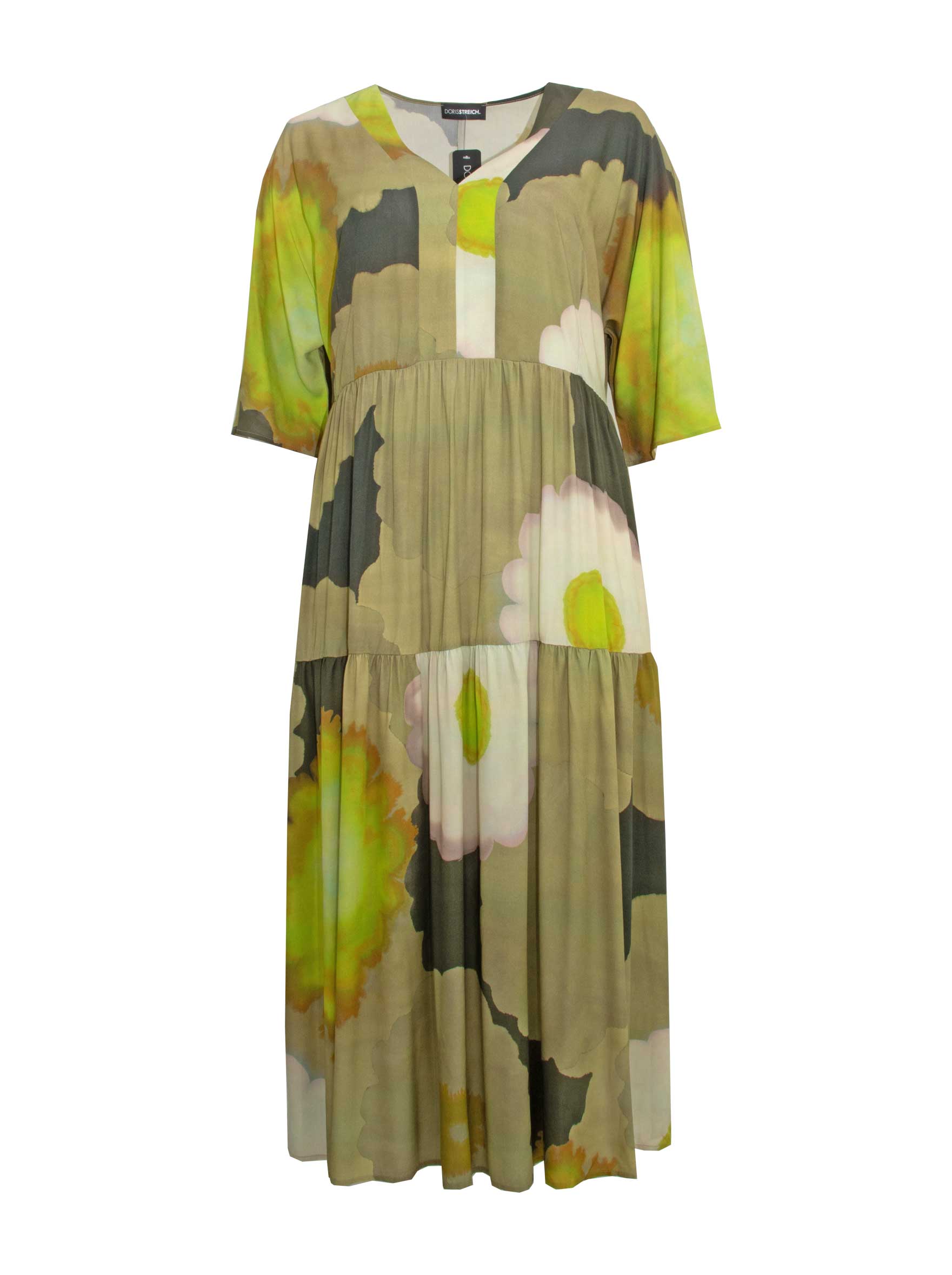 Fließendes Boho-Maxikleid aus leichter Viskose in frischen Grüntönen mit abstraktem Druck. Luftig, feminin und ideal für Sommer-Events von Doris Streich.