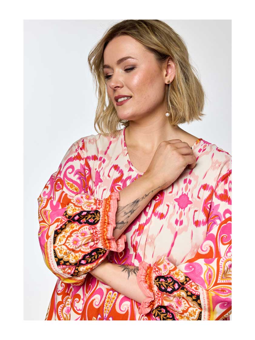 Das ornamentartige Paisley-Muster der Tunika-Bluse von Gozzip wirkt wie ein Farbspiel aus Sonnenaufgang und Sommerblumen – lebendig, feminin und kraftvoll. Die weich fließende Viskosequalität umspielt die Figur, während die gesmockten Ärmelabschlüsse und der leichte Rundhalsausschnitt mit Schlitz charmante Details setzen.