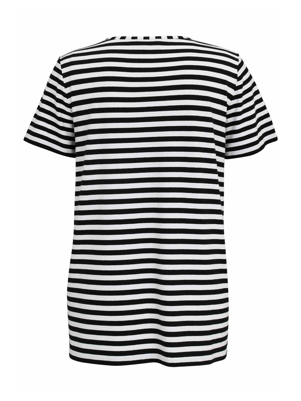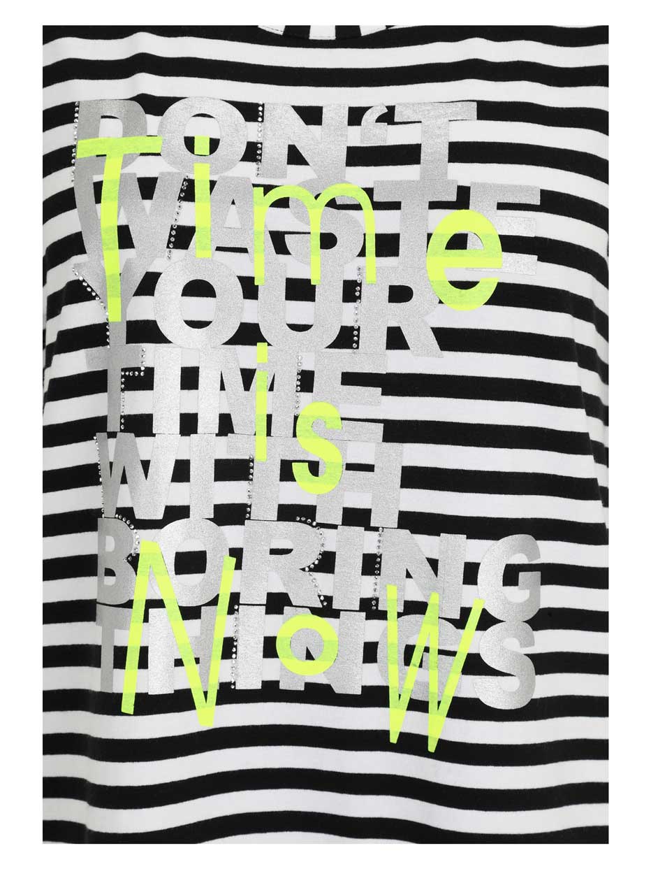 Schwarz-weißes Ringelshirt aus hochwertigem Viskose-Jersey von Doris Streich mit frischem, modernem Look durch den silber- und neonfarbenen Schriftzug. Kurze Ärmel und Rundhalsausschnitt machen das Shirt zu einem vielseitigen Basic für Alltag und Freizeit.