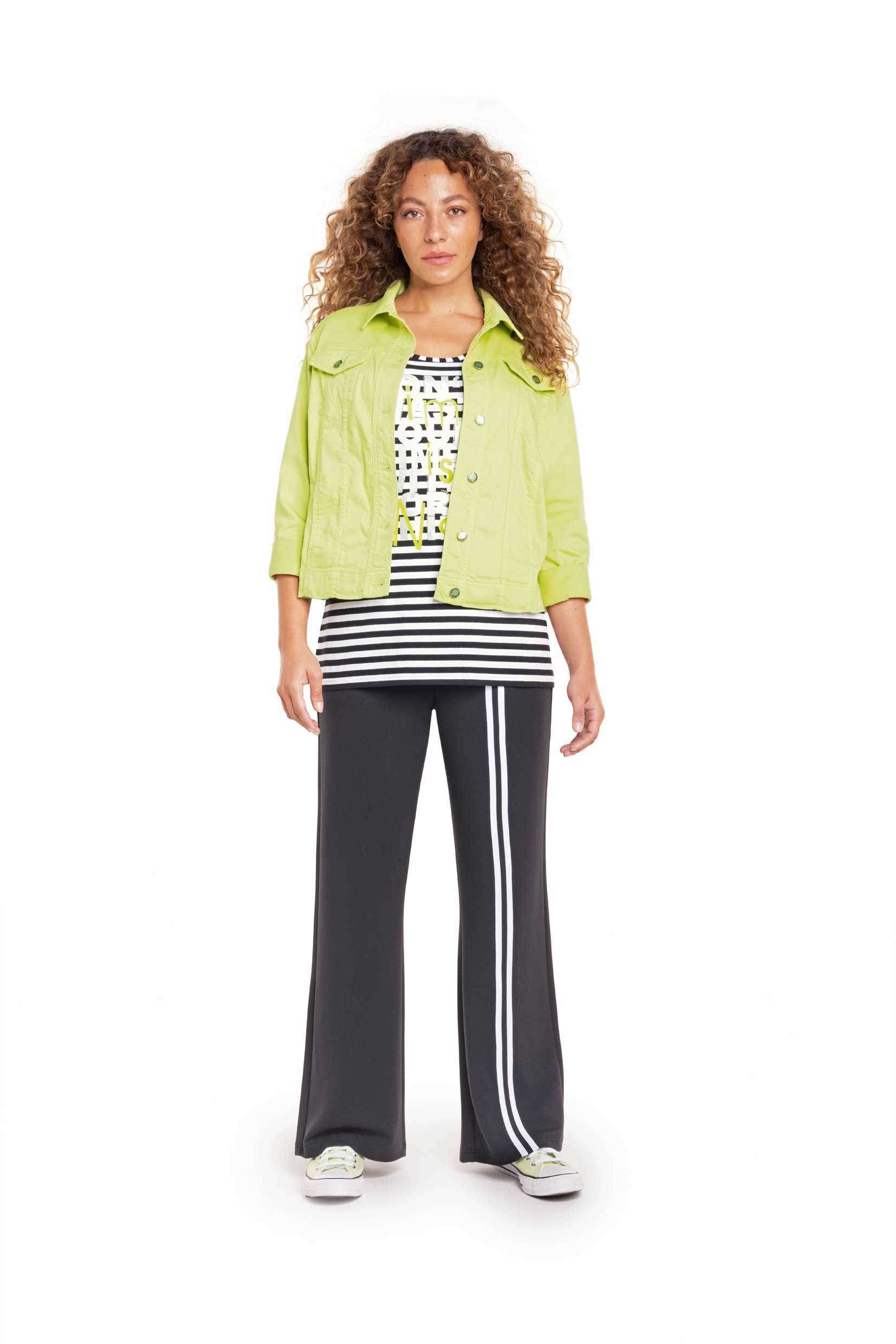 Klassischer Streifenprint mit neongrünen Schriftzug – ein Eyecatcher, der jedes Outfit aufwertet