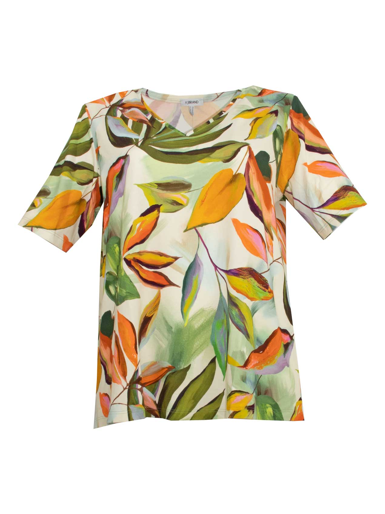 Der lebendige Print in Grüntönen bringt Frische und Dynamik mit dem gemusterten Halbarm-Shirt von Kj BRAND. Der V-Ausschnitt betont das Dekolleté während die A-Form locker fällt.