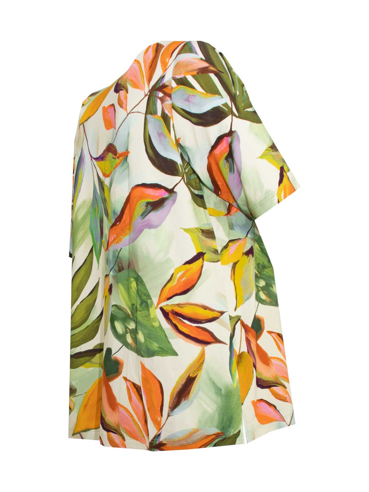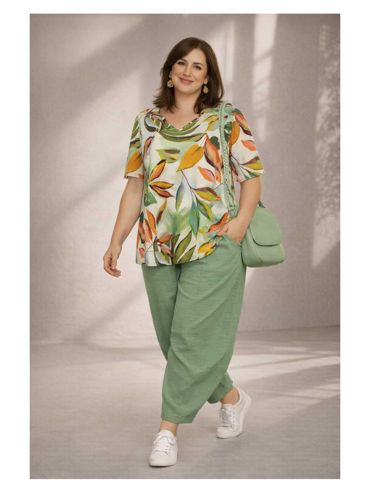 Lebendiger Print in Grüntönen mit sanften Akzenten von Gelb, Orange und Pink in einer harmonischen Farbkomposition