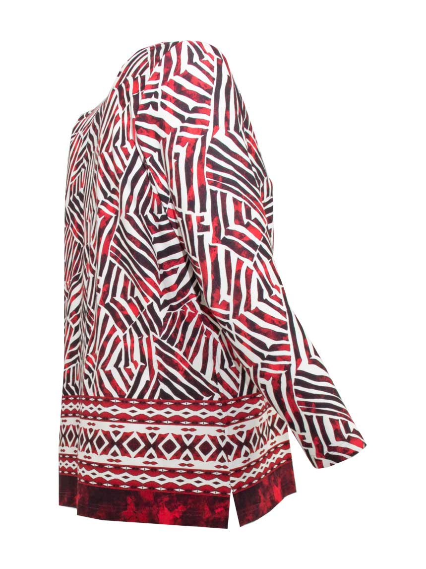 Das Langarm-Shirt von Kj BRAND vereint stilvolles Design mit optimalem Tragekomfort. Das geometrische Muster in Bordeaux-Rot, Schwarz und Weiß sorgt für einen dynamischen Look, während der V-Ausschnitt und die lockere Passform die Figur sanft umspielen.