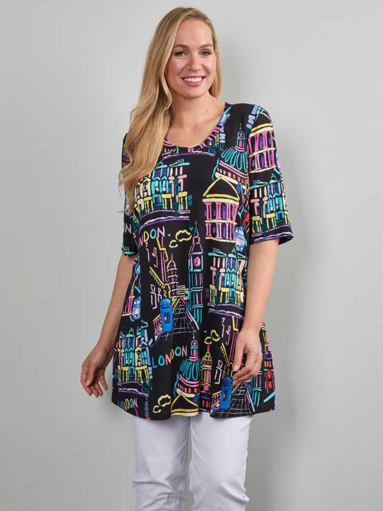 | Styling Tipps: mit schwarzer oder weißer Hose tragen, die A-Linie wirkt besonders schön, wenn die Hose schmal bleibt Farbharmonie nutzen: mit einer Tasche oder einem Armband in Pink, Blau oder Gelb die bunten Akzente des Prints aufgreifen Offene Sandalen oder weiße Sneaker unterstreichen den frischen Look Dezenter Schmuck in Gold oder Silber sorgt für Eleganz, ohne den Druck zu überladen |