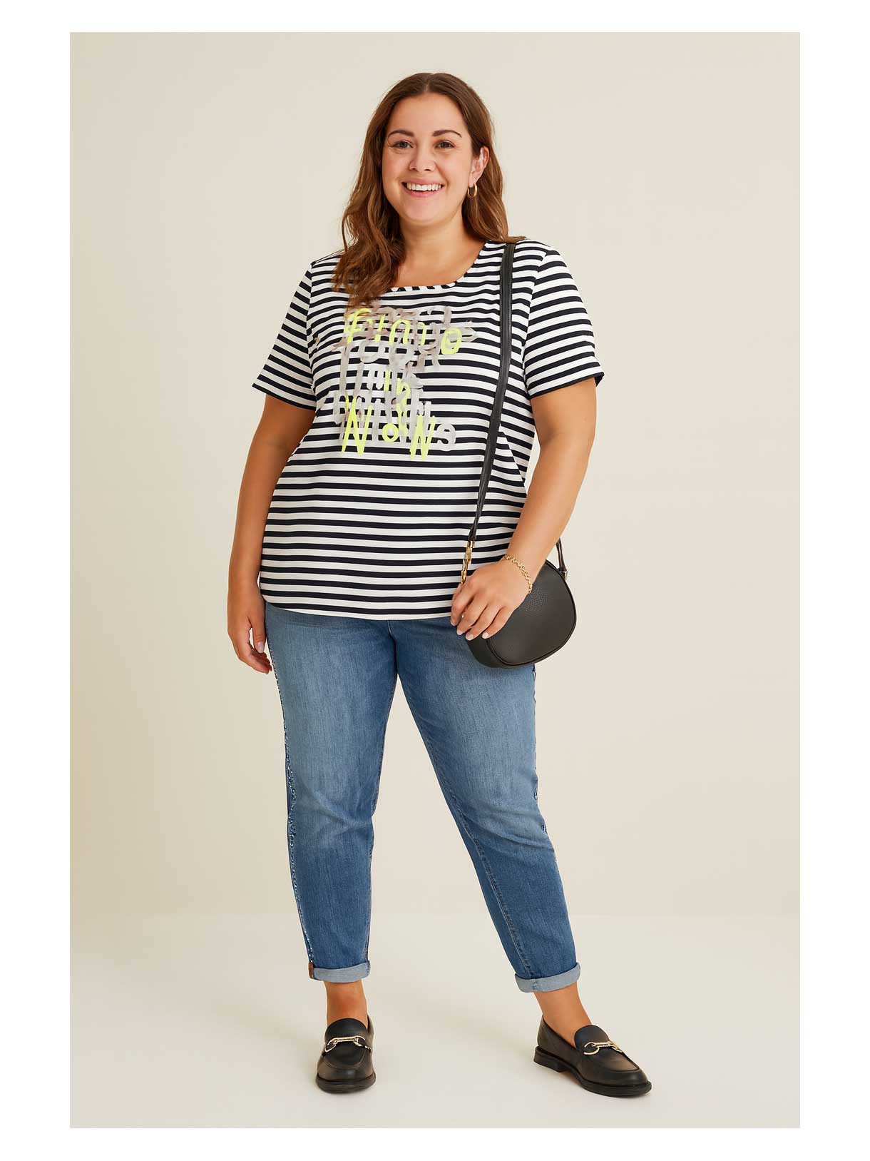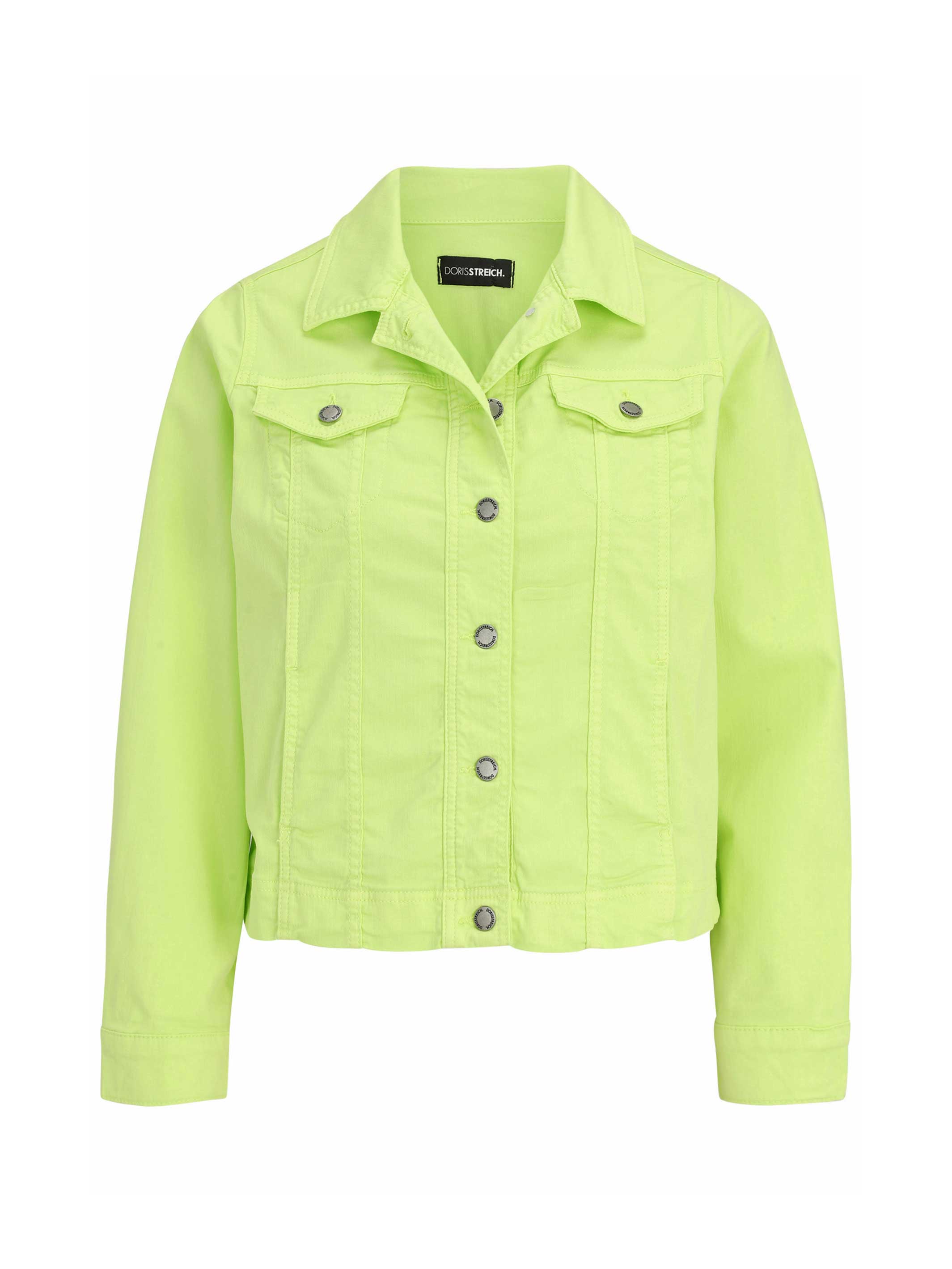 Farbe, Struktur und Persönlichkeit für Ihren Kleiderschrank von Doris Streich: Das gestreifte Shirt mit auffälligem Neonschriftzug sorgt für modernen Twist und die leuchtend grüne Baumwolljacke mit der mittelblauen Glitzer-Jeans runden den Look ab.