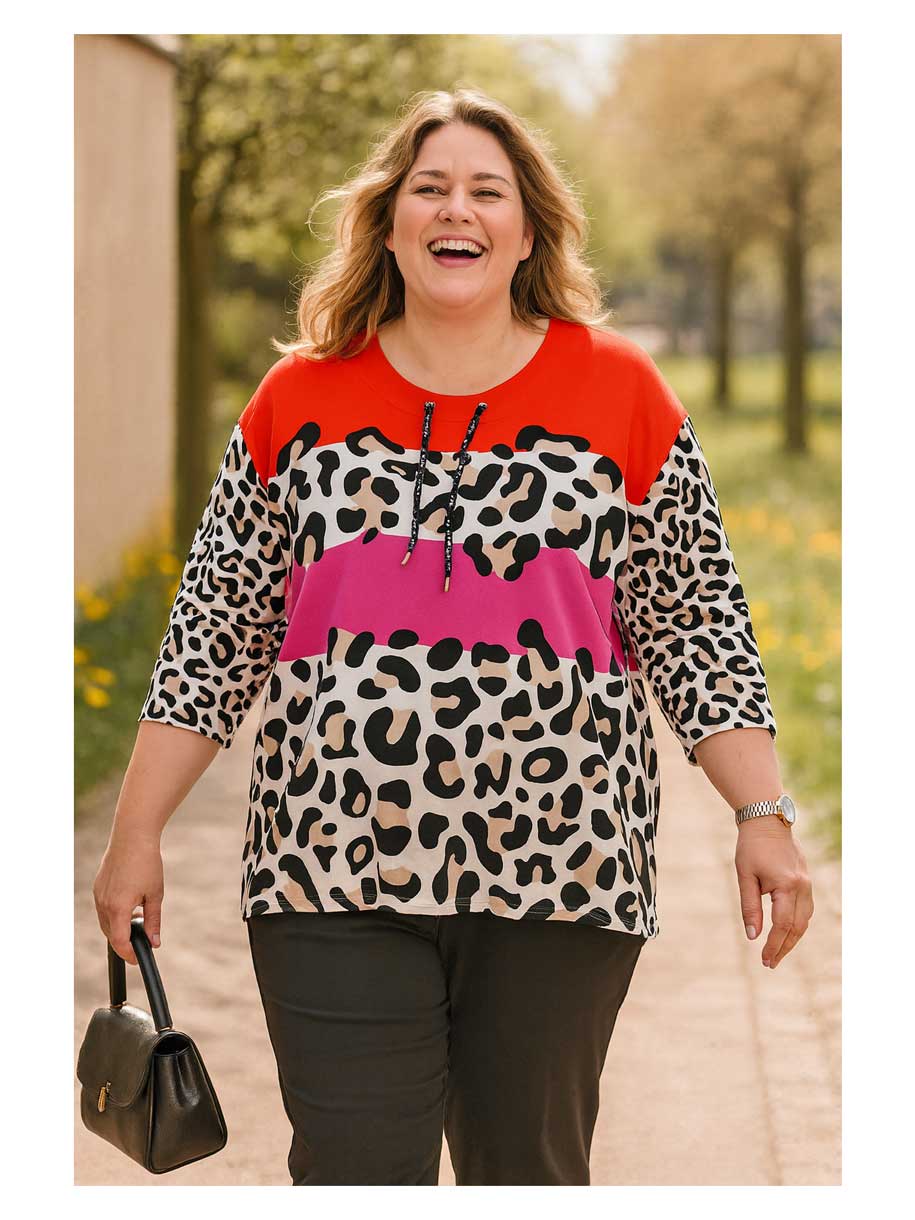 Farbstarkes Frühlingsshirt trifft auf lässige Jeggings: Das Doris Streich Shirt kombiniert Animal Print mit kräftigem Orange-Rot und Pink – ein echtes Statement für den Frühling. Die schwarze Jeggings von KjBRAND mit elastischem Superstretch Denim sorgt für Komfort und eine schöne Silhouette.