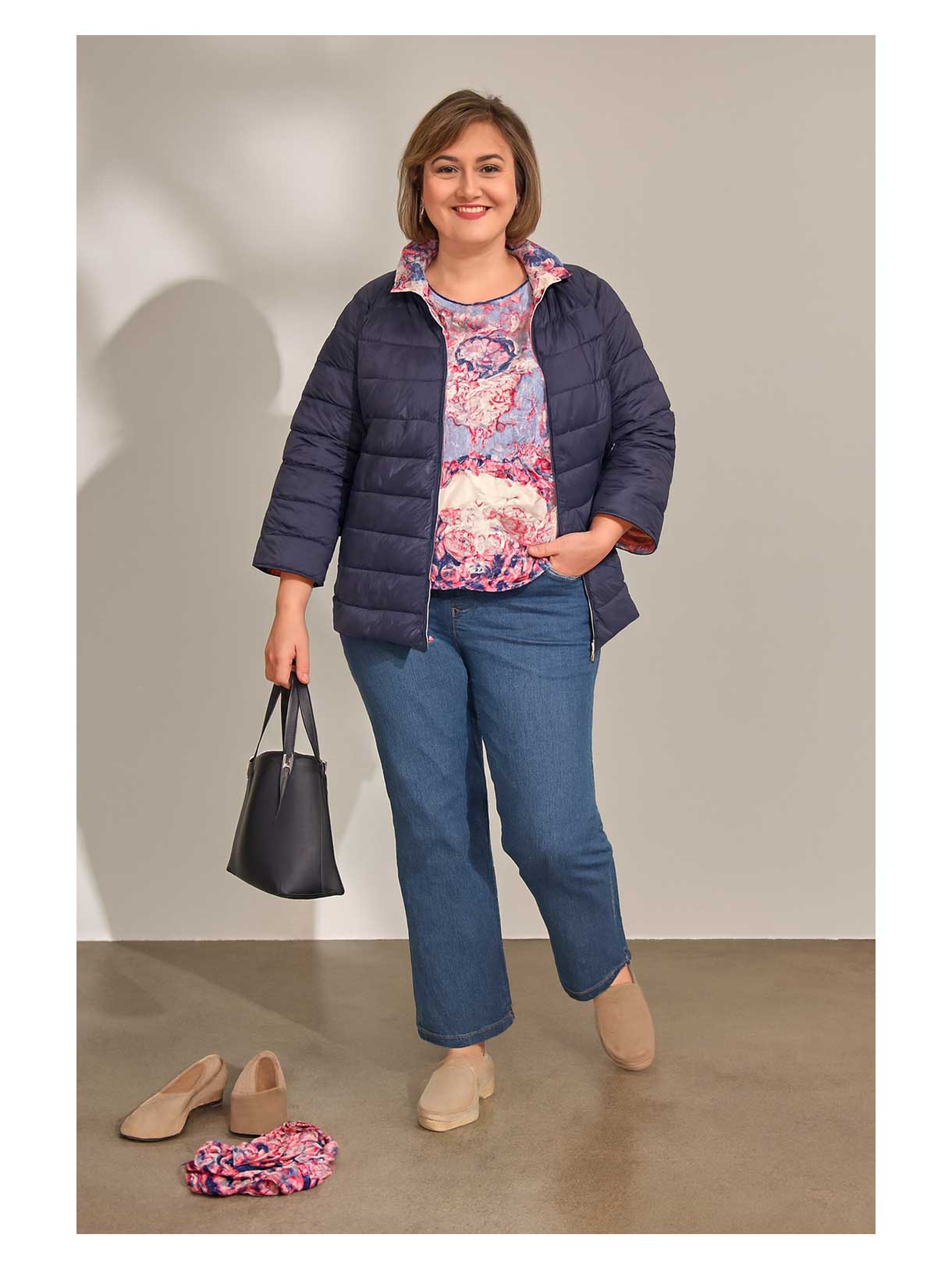 Leichte Steppjacke zum Wenden von Elena Miro: Außen zeigt sie sich in modernem Navy – clean, klar und vielseitig kombinierbar. Innen überrascht sie mit einem kunstvollen Rankenmuster, das dem Look eine lebendige, feminine Note verleiht. Ideal für wechselahfte Tage, an denen Leichtigkeit und Funktionalität gefragt sind. Das reversible Design eröffnet zusätzliche Styling-Möglichkeiten