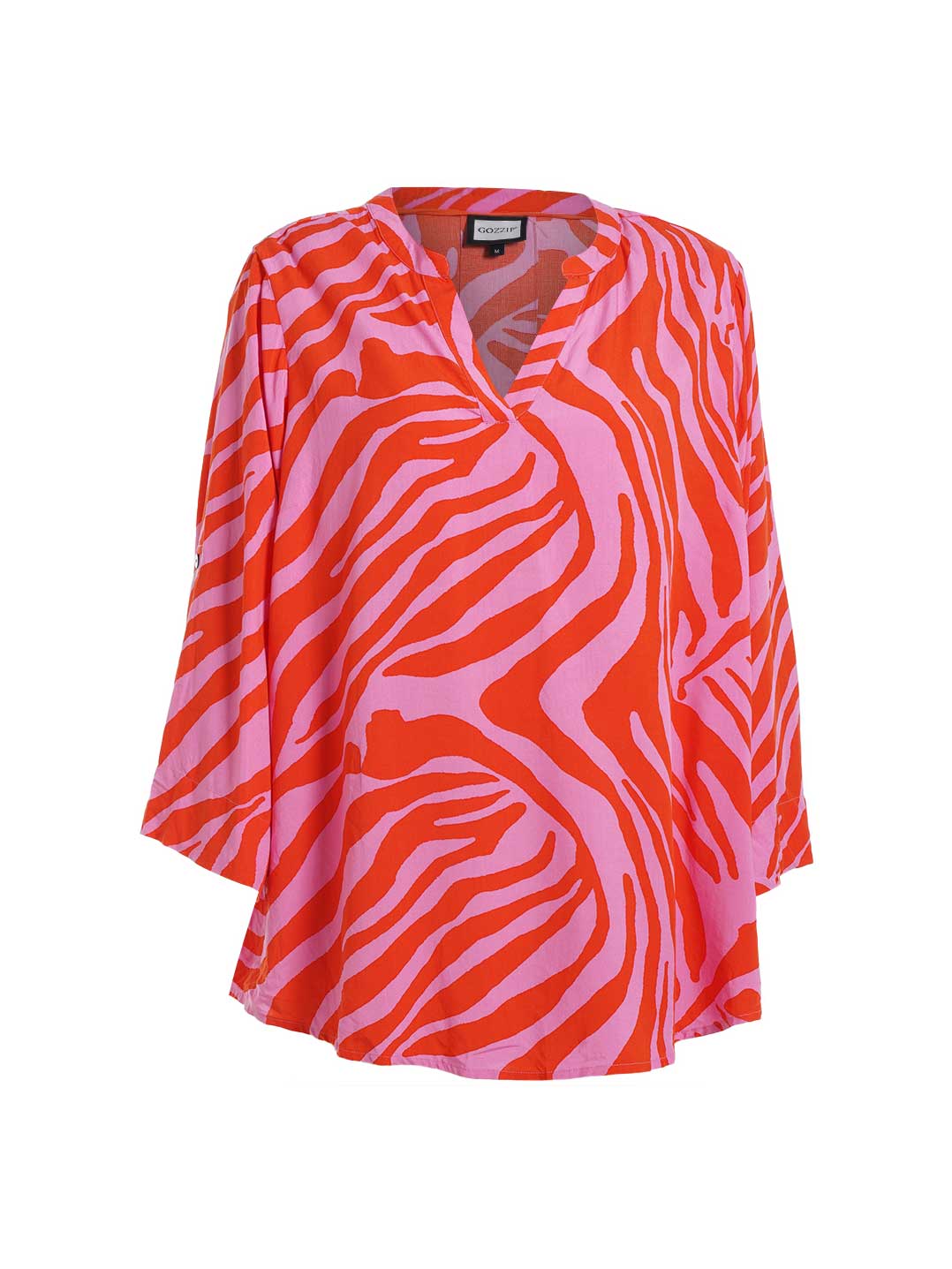 Farbe uns Bewegung für den Alltag von Gozzip: Pink und Orangerot gemusterte Bluse mit V-Ausschnitt und fließendem Schnitt mit einer pinken Barrel Leg Hose aus leichter Baumwolle