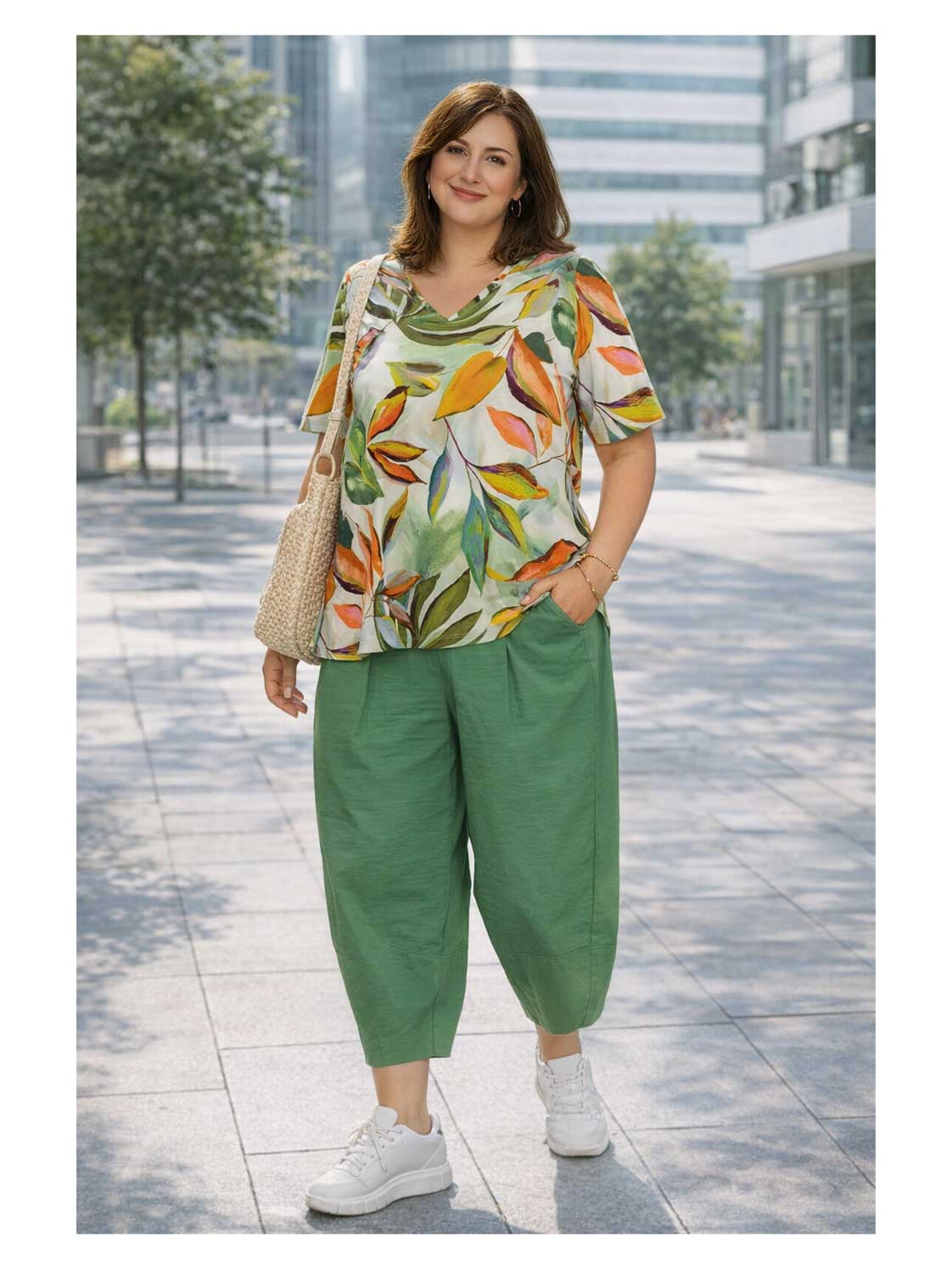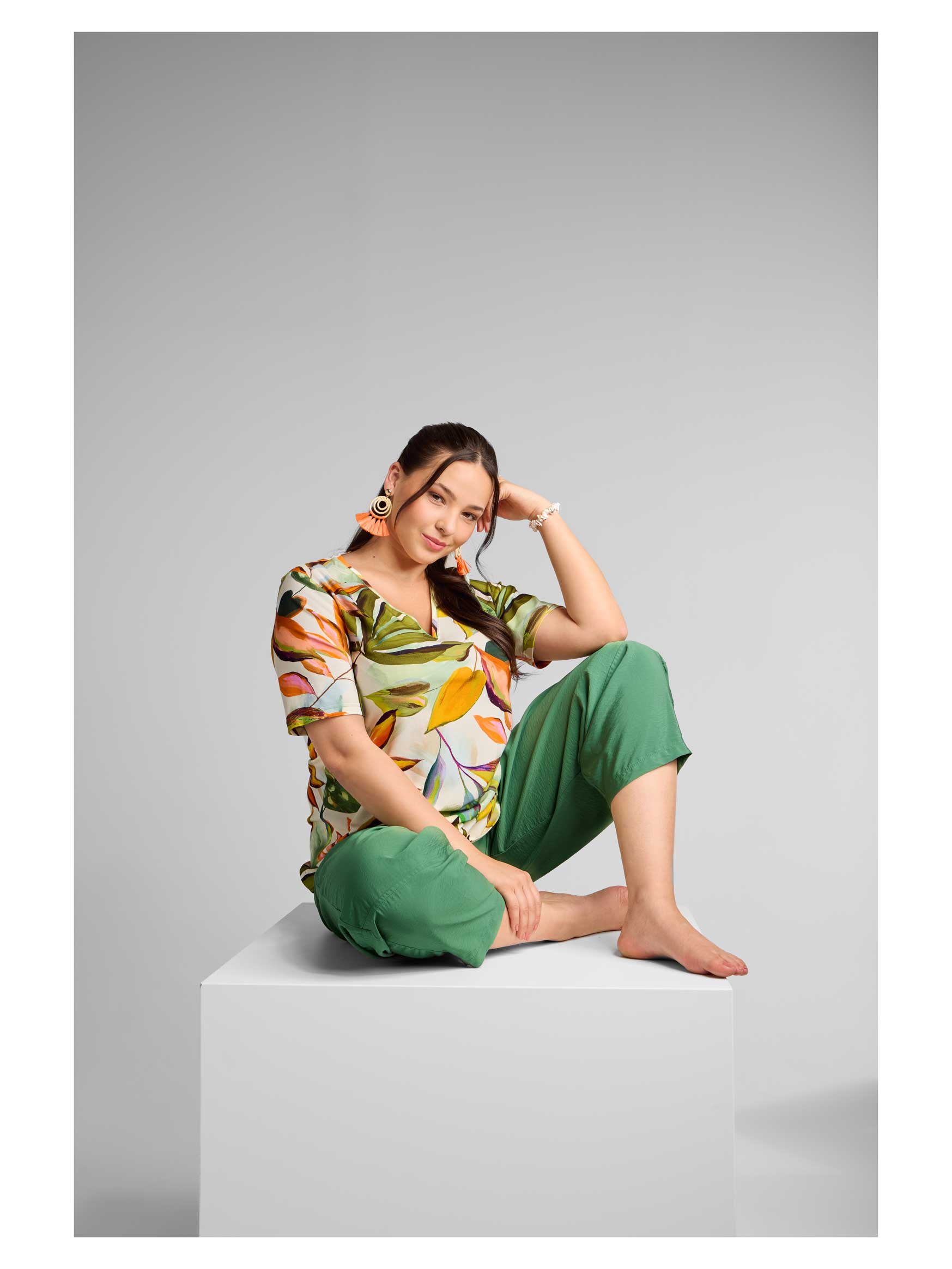 Leichtigkeit, moderne Silhouetten und Curvy-Ästhetik von Kj BRAND: Das gemusterte Shirt mit A-Linie setzt eine wunderbar fließende Linie, die modische Barrel Leg Hose ergänzt das Shirt mit einer entspannten, trendbewussten Form.