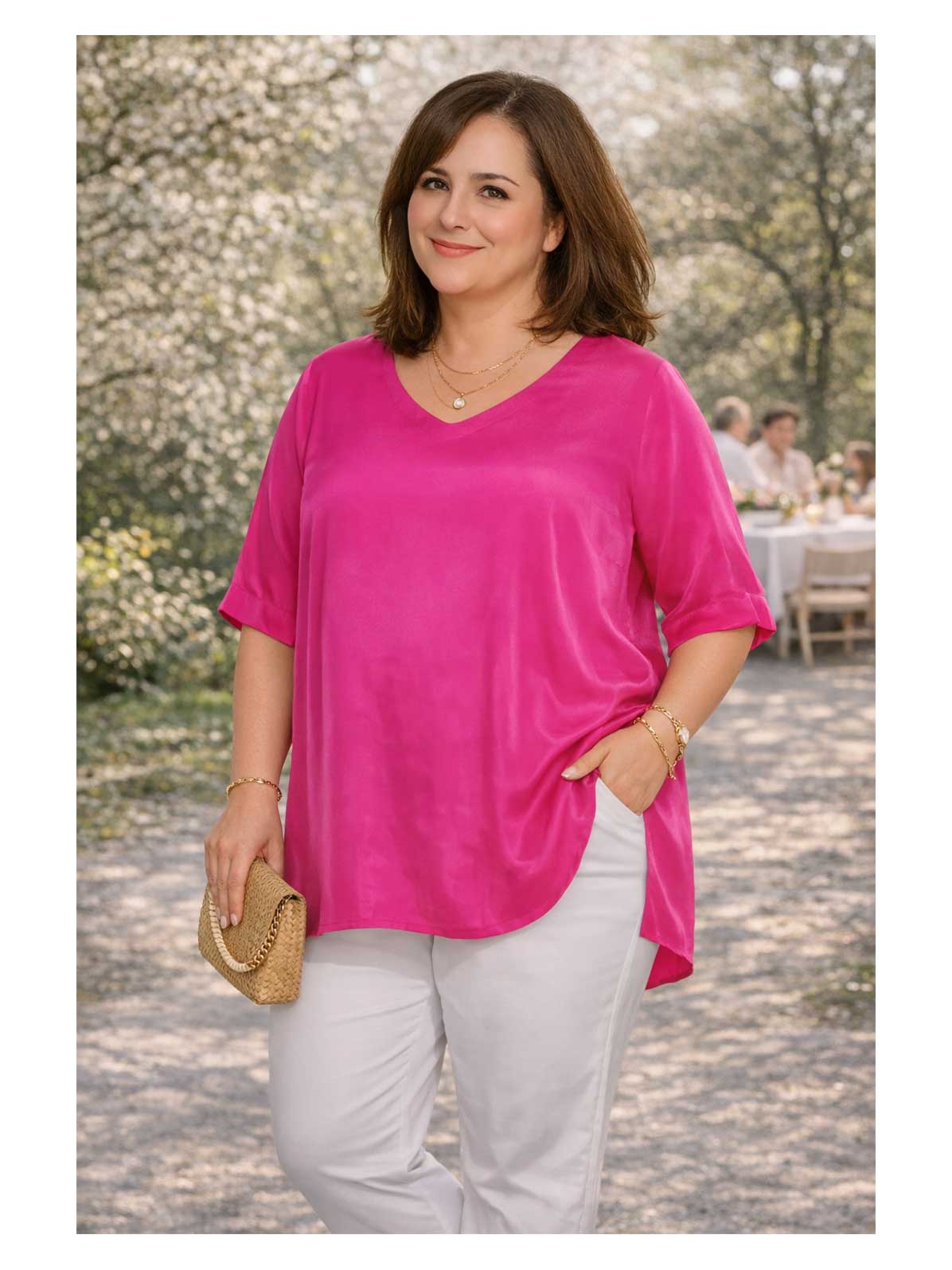 Die weiße Sensitive Hose ergänzt die fließend fallende pinkfarbene Tunika von Kj BRAND mit softer Haptik und ultrabequemem Tragegefühl. Klarer Kontrast lässt das Pink der Tunika besonders leuchten. Komfort und modische Frische vereint. Ideal für Familienfeiern, Gartenfeste, city-Tage oder entspannten Bürotag.