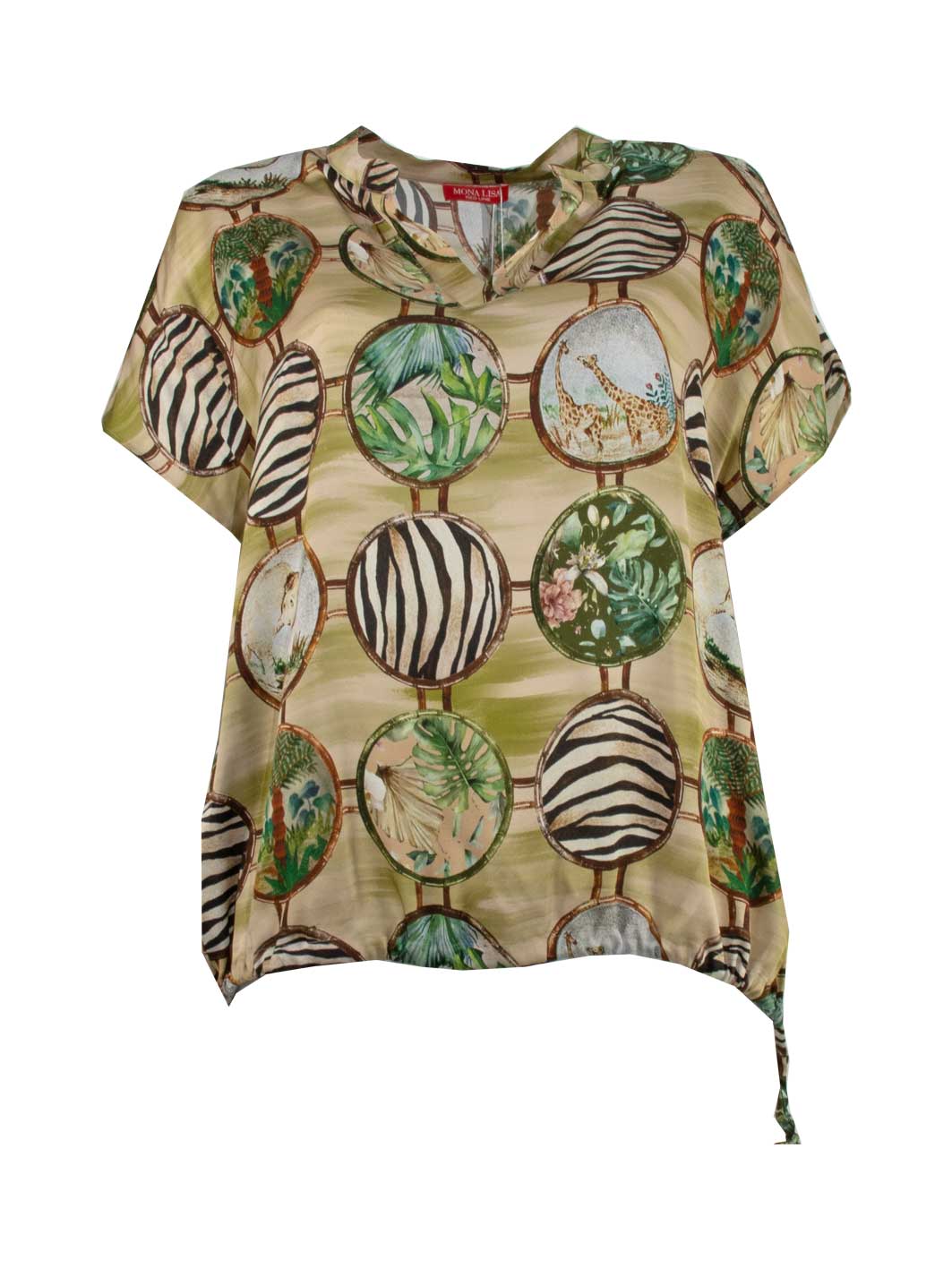 Das kurzärmelige Blusenshirt mit Tunnelzug zeigt ein sanftes, künstlerisches Printspiel in soften Naturtönen.