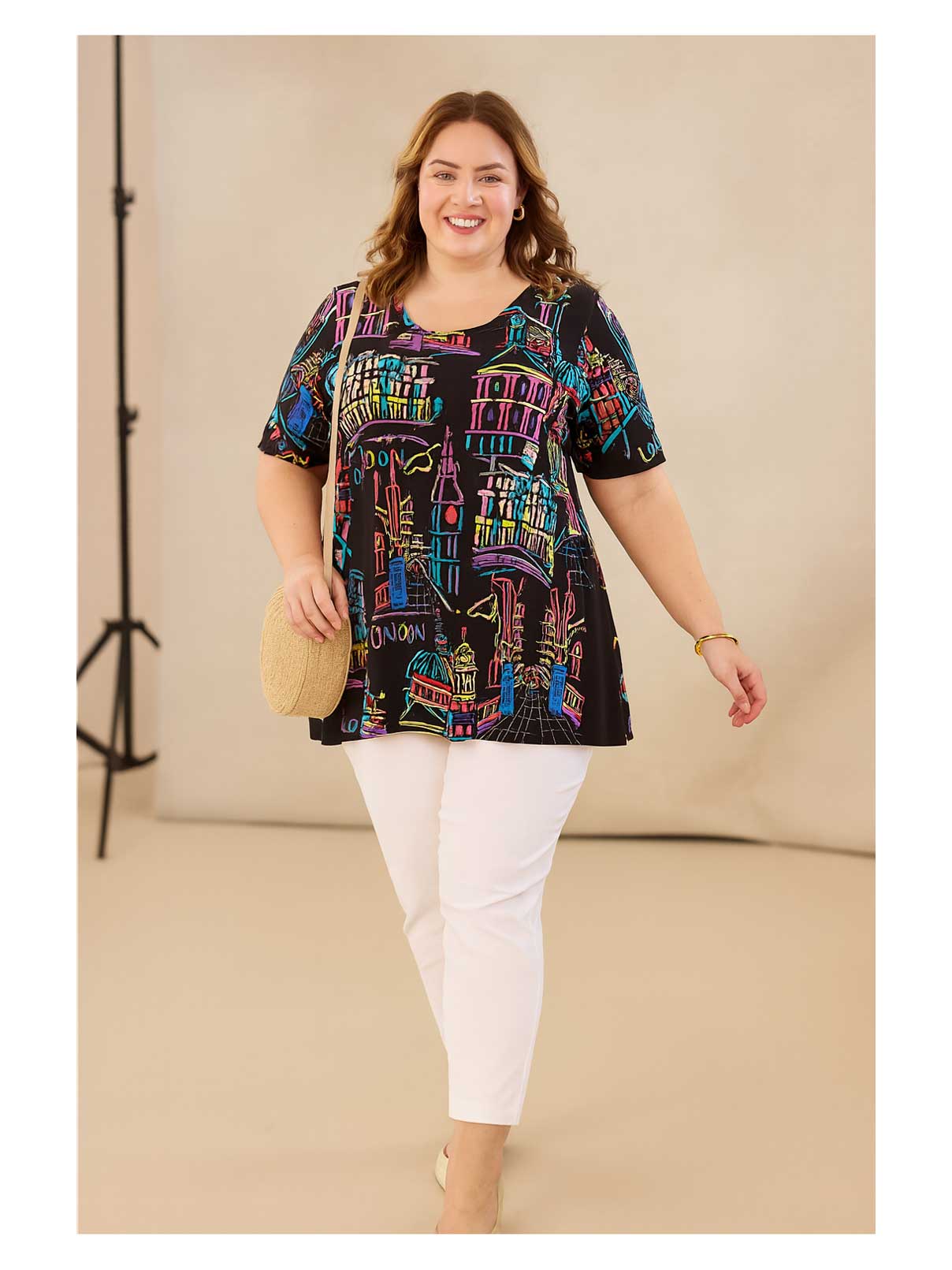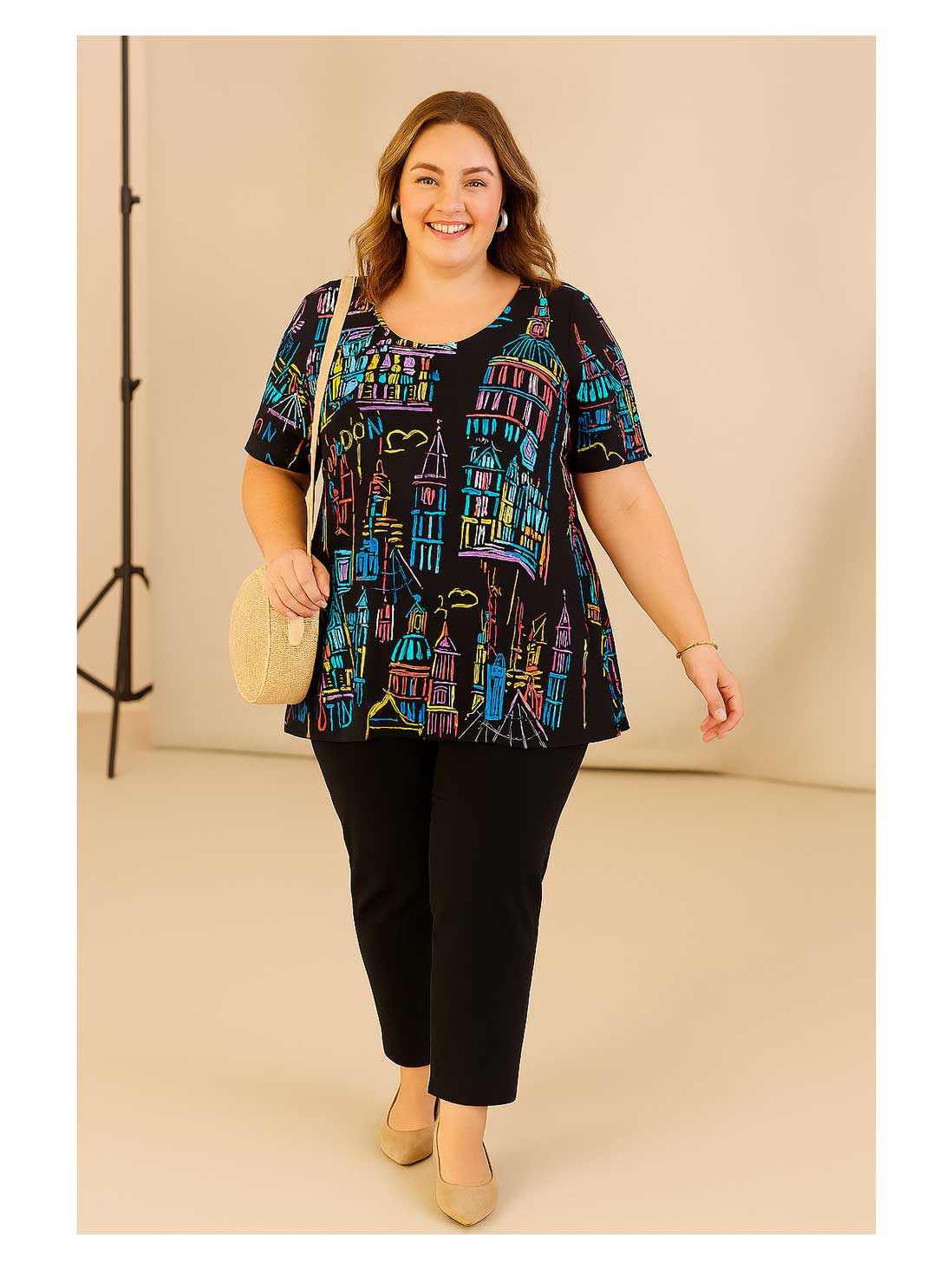 Entdecken Sie das farbenfrohe Long-Shirt in A-Linie mit exklusivem London-Print von Mona Lisa, kombiniert mit schwarzer Sensitive Hose – luftig, bequem und perfekt für Frühjahr-Sommer. Die weiche Qualität umspielt die Figur und setzt ein modisches Statement mit dem lebendigen Print. Perfekt für City-Looks, Urlaub, Alltag und Büro.