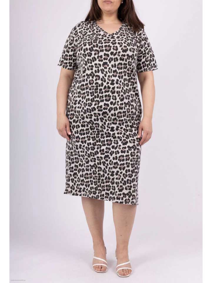 Featuring a trendy leopard print, this comfortable summer T-shirt dress can be styled casually or elegantly. It features a flattering V-neck and short sleeves, and a fairly straight cut. Perfect for warm summer days. One size fits approx German size  42-48